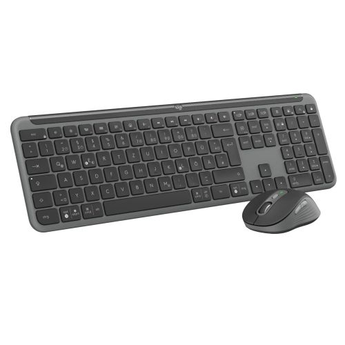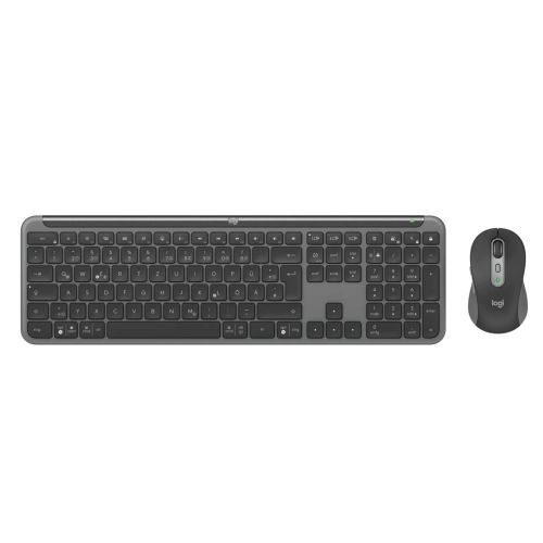 Das Desktop-Set LogitechSignature Slim Combo MK950 for Business besteht aus der Signature K950 for Business Tastatur und der Signature Plus M750 for Business Maus. Die schlanke Tastatur in Standardgröße und die geschwungen geformte Maus sorgen für modernes Design und Komfort für Ihren Schreibtisch. Die kabellose Logi Bolt Technologie sorgt für eine sichere und zuverlässige Verbindung, selbst in stark belasteten, kabellosen Umgebungen. Die flachen Scissor-Tasten sind leicht konkav, um ein vertrautes Tipperlebnis wie auf einem Notebook zu bieten. Das SmartWheel der Maus ermöglicht schnelles Umschalten zwischen präzisem zeilenweisen oder superschnellem Scrollen und durch die Silent Touch Technologie macht die Maus 90 % weniger Klickgeräusche. Dank EasySwitch lässt sich das MK950 mit drei verschiedenen Geräten verbinden (z.B. Notebooks und Tablets) um nahtlos zwischen ihnen umzuschalten. Hergestellt mit mindestens 61 % recyceltem Kunststoff und mit FSC™-zertifizierter Verpackung trägt die Signature Slim Combo MK950 for Business zur Reduzierung der Auswirkungen auf die Umwelt bei.