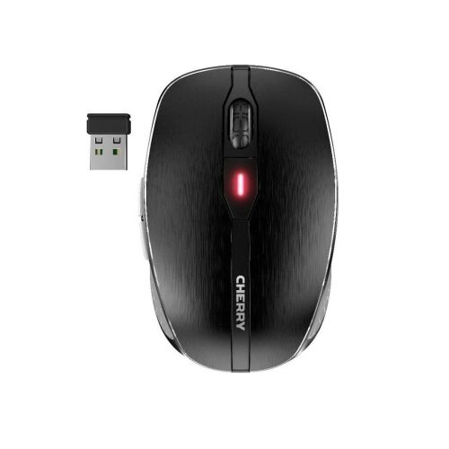 Die CHERRY MW 8 ADVANCED-Maus vereint edle Materialien, zeitloses Design und modernste Technik zu einem Eingabegerät der Spitzenklasse. Eine Oberfläche aus eloxiertem Aluminium schmiegt sich in Kombination mit gummierten Seitenteilen und einer kompakten Form angenehm in die Hand. Durch einen hochpräzisen Sensor mit Laser-LED, funktioniert die Maus auf nahezu allen Oberflächen, inklusive Glastischen. Die Auflösung lässt sich dabei 4-stufig per Knopfdruck einstellen: 600, 1000, 1600 oder 3200 dpi. Der Akku lässt sich auch während des Betriebes über das beiliegende USB Kabel wieder aufladen. Eine zweifarbige Status-LED gibt einem dabei jederzeit Auskunft über den Batteriestatus, den Ladestatus, die gewählte Auflösung oder den Verbindungsstatus. Die Maus kann wahlweise mit dem beiliegenden 2,4 GHz Funk USB-Empfänger oder per Bluetooth verbunden werden. Ein extra langlebiges Mausrad mit optischer Abtastung, eine magnetische Verriegelung für den USB-Receiver sowie der beiliegende Transportbeutel sind weitere Details, die keine Wünsche offenlassen. Die Maus ist für mobile und stationäre Anwendung gleichermaßen geeignet.